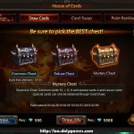 Hey guys, for those of you who are interested in drop rates, i.e. what types of cards you get by paying to open cards in the House of Cards event in League of Angels then here I have prepared the pictures of all the cards I got by paying diamonds to open 10 times the Common, Deluxe and Mystery Chests.