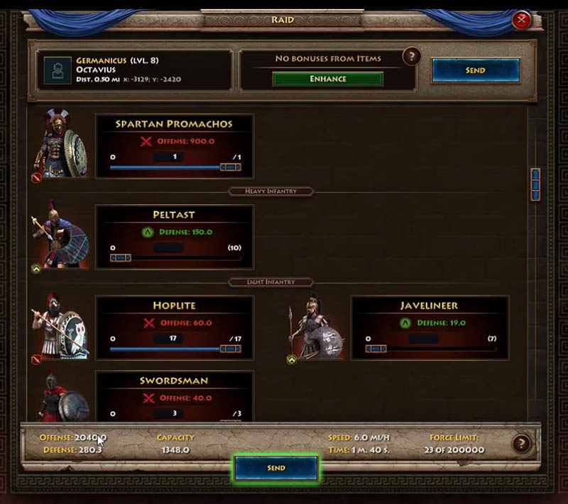 I feel one of the most important parts of the game is to compose a powerful army with which you raid your enemies and capture their resources. Here many things matter: unit types, carrying capacity, speed, offensive power, various bonuses, etc. On the picture below I am preparing for my first raid lead by my most powerful unit, the awesome and amazing Spartan Promachos 🙂