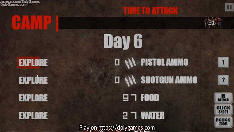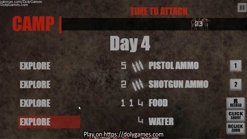 When in the CAMP between battles you will need to think smart and explore for Food, Water and Ammo. If you run out of any resources you will die, so make sure to have good levels of everything. In the CAMP you can also Pause the game – this is possible only in the camp and not during zombie attacks. Shooting well: Shooting is not random. It is important to shoot accurately. Different parts of the body will receive different damage. Head-shots are possible and getting shot in the legs is the least damaging for the zombies. Lastly: It took many hours/days to create this game. Please consider to support either via Patreon or via purchasing of the Supply Pack. I am happy to continue developing all my games especially with the support of people. Patreons / Sponsors feel free to email me your wishes/ideas.